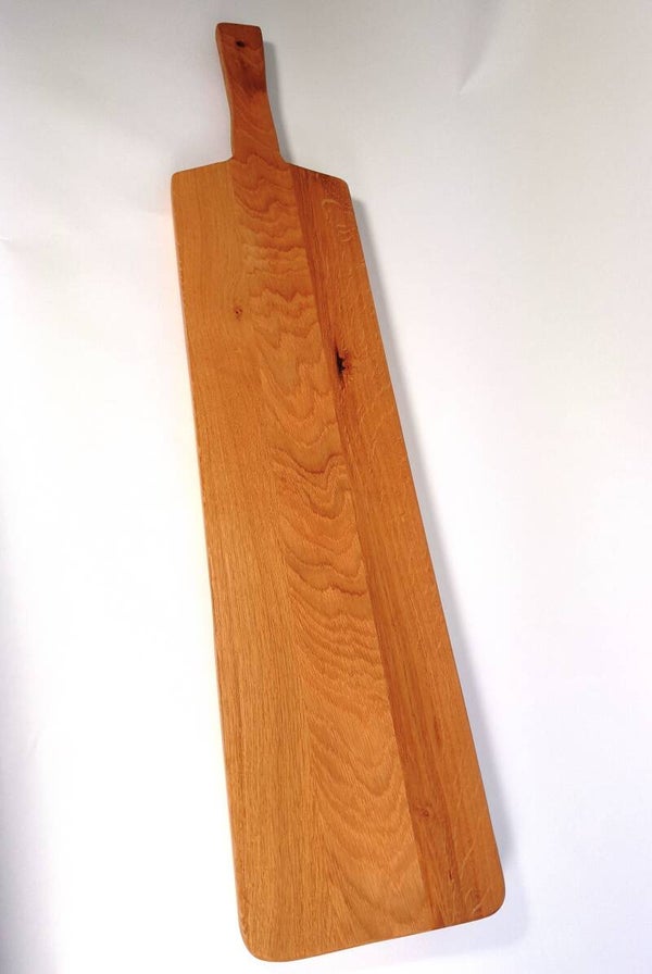 Borrelplank van eikenhout. Het handvat is 20 cm, de lengte van het serveergedeelte is variabel.